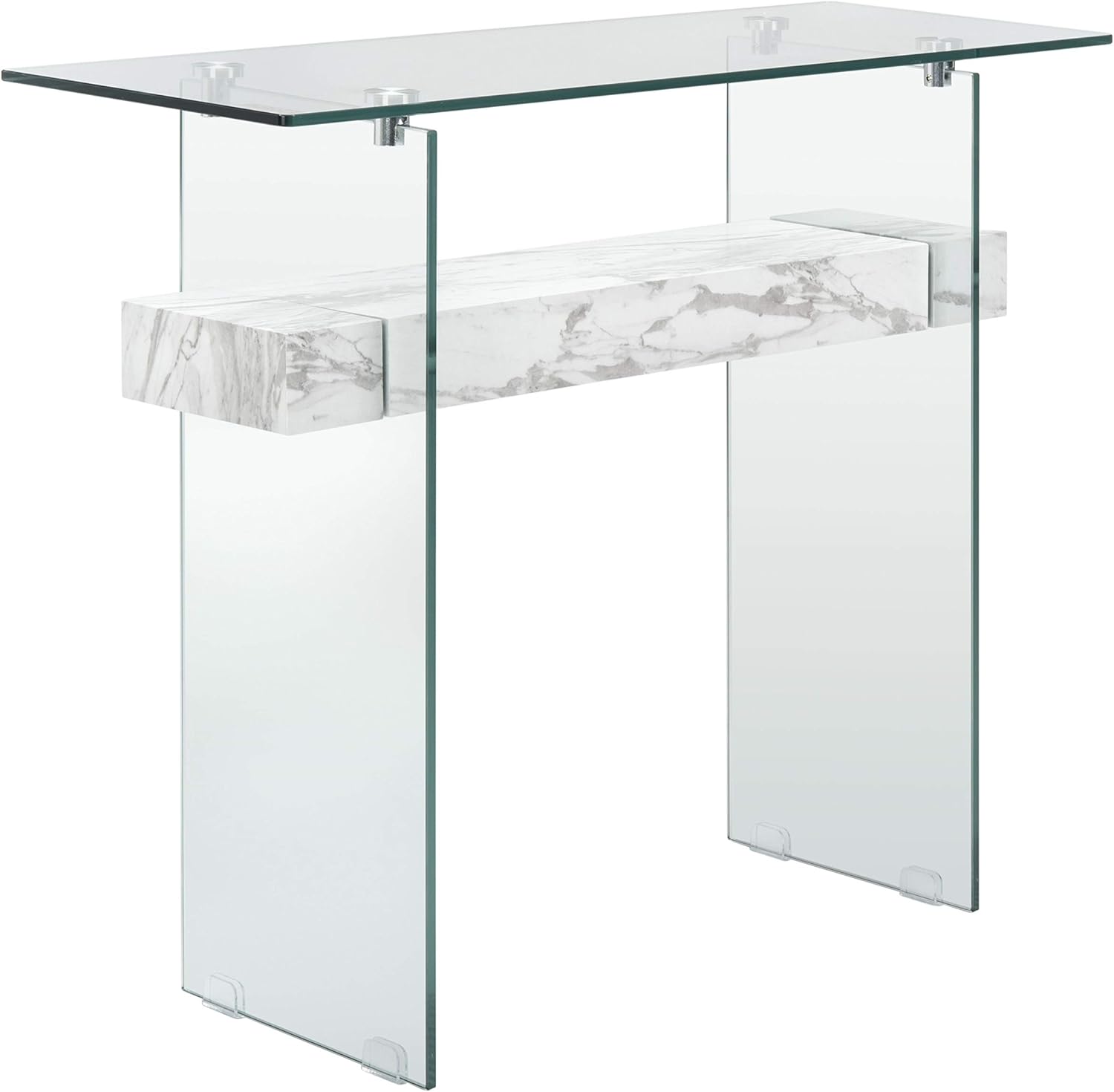 - Ideal for the living room, hall, or foyer, its chic geometric lines were designed with a white marble MDF wood finish and transparent glass