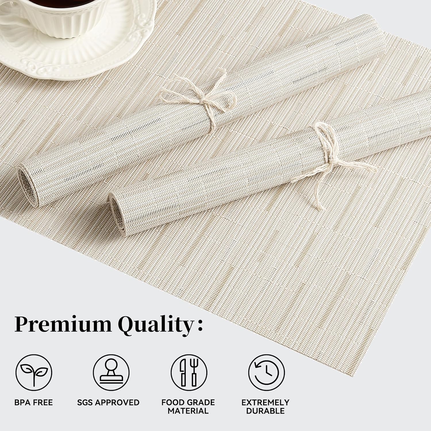 - Premium Quality and Durability: Our placemats are crafted from a superior blend of 70% PVC and 30% Polyester, ensuring exceptional quality and long-lasting durability. Endorsed by SGS certification, they are guaranteed to meet the highest standards.