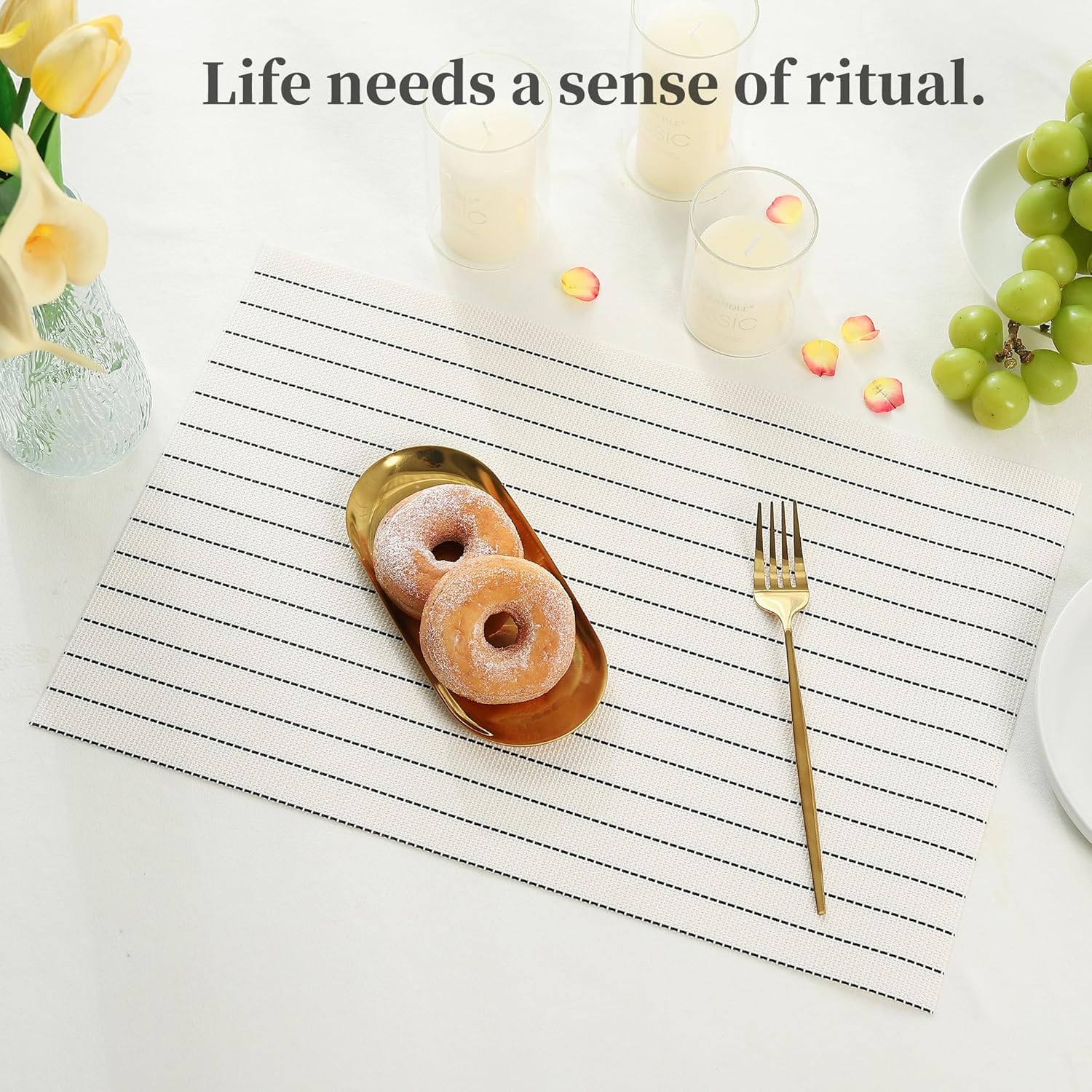 Leetaltree White with Black Stripes Placemats Set of 6 - Heat Resistant Non-Slip Place mats for Dining Table, Washable Durable PVC Vinyl Woven Table Mats(White Stripes, 6)