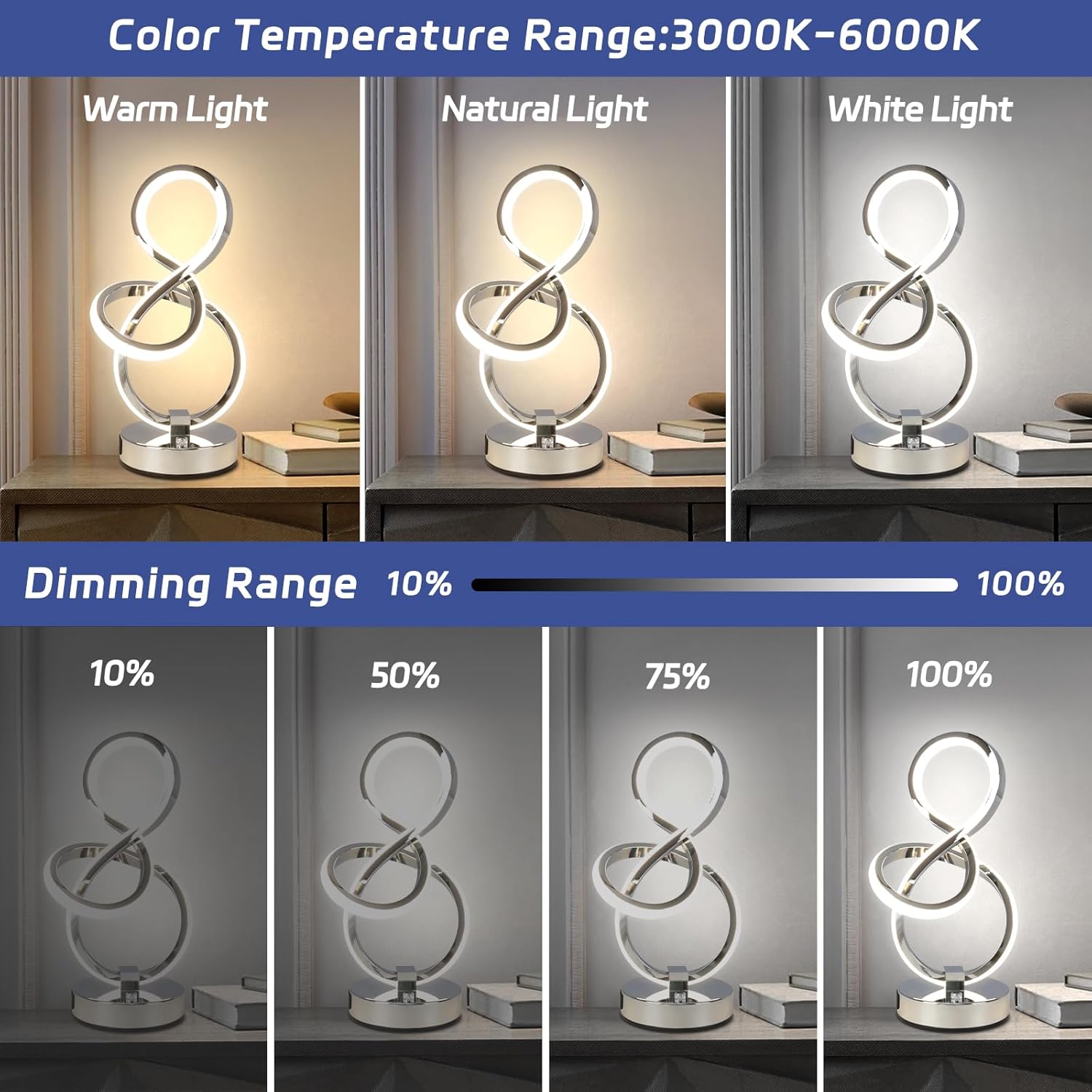 - 【3 Colors 10 Brightness Level Dimmable Touch Control】- The USB Touch Control nightstand lamp has 3 color temperatures (3000K warm light, 4500K white light, 6500K natural light). Each color temperature mode is dimmable. The brightness of each color can be adjusted from 10-100%, Light touch to turn on/switch color mode, long press for 3 seconds to turn off,simply click the button to change the lighting effect to suit your room