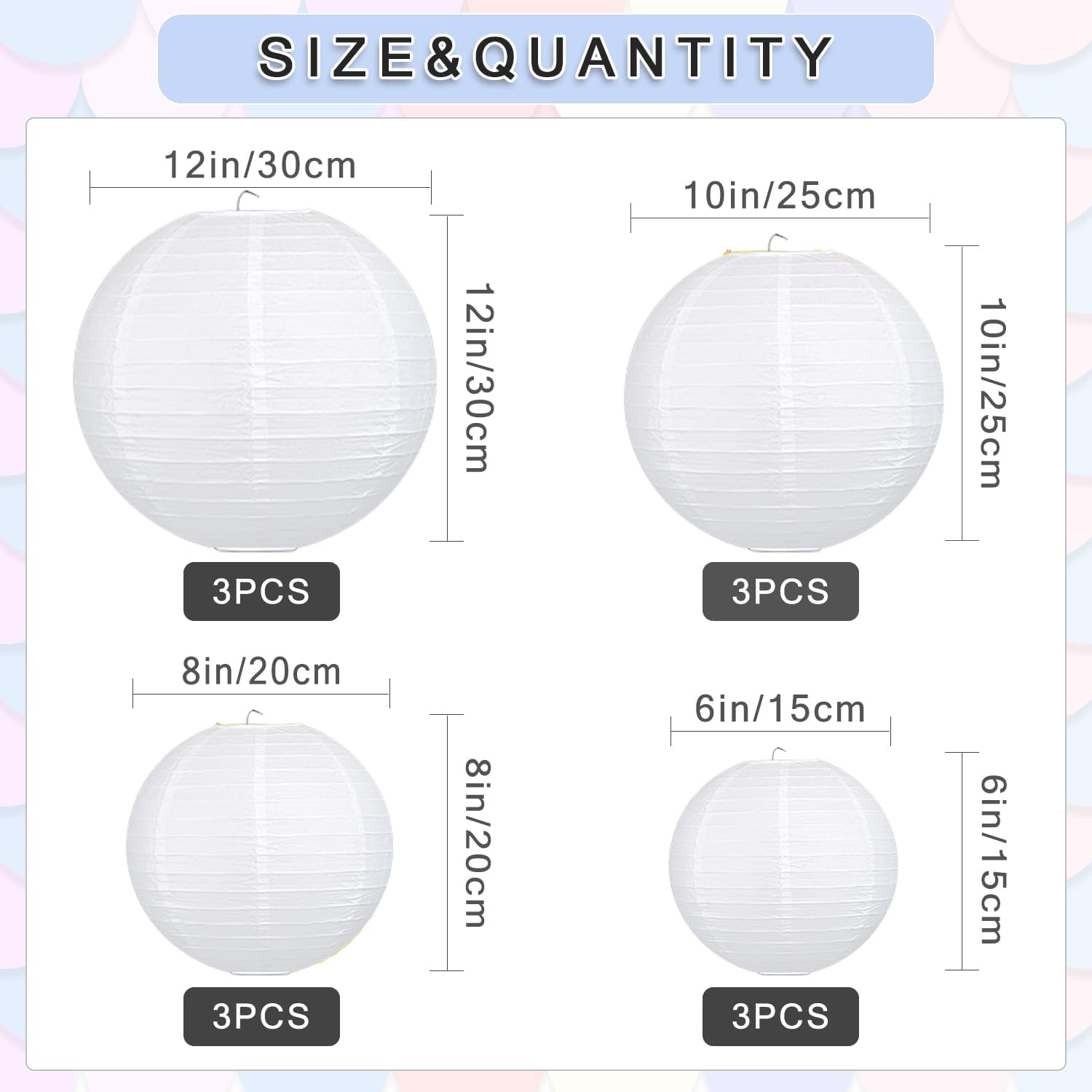 - Included Components : White Paper Lanterns (6 Inch * 3pcs , 8 inch * 3pcs , 10 inch * 3pcs , 12 inch * 3pcs)