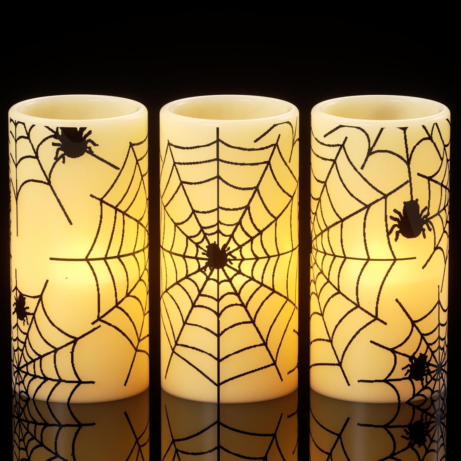 - Creative Spider Decals: Three flameless candles with three different spider decals, real wax flickering candles add horror and creepy atmosphere for Halloween home party decoration. Just light up your Halloween day.