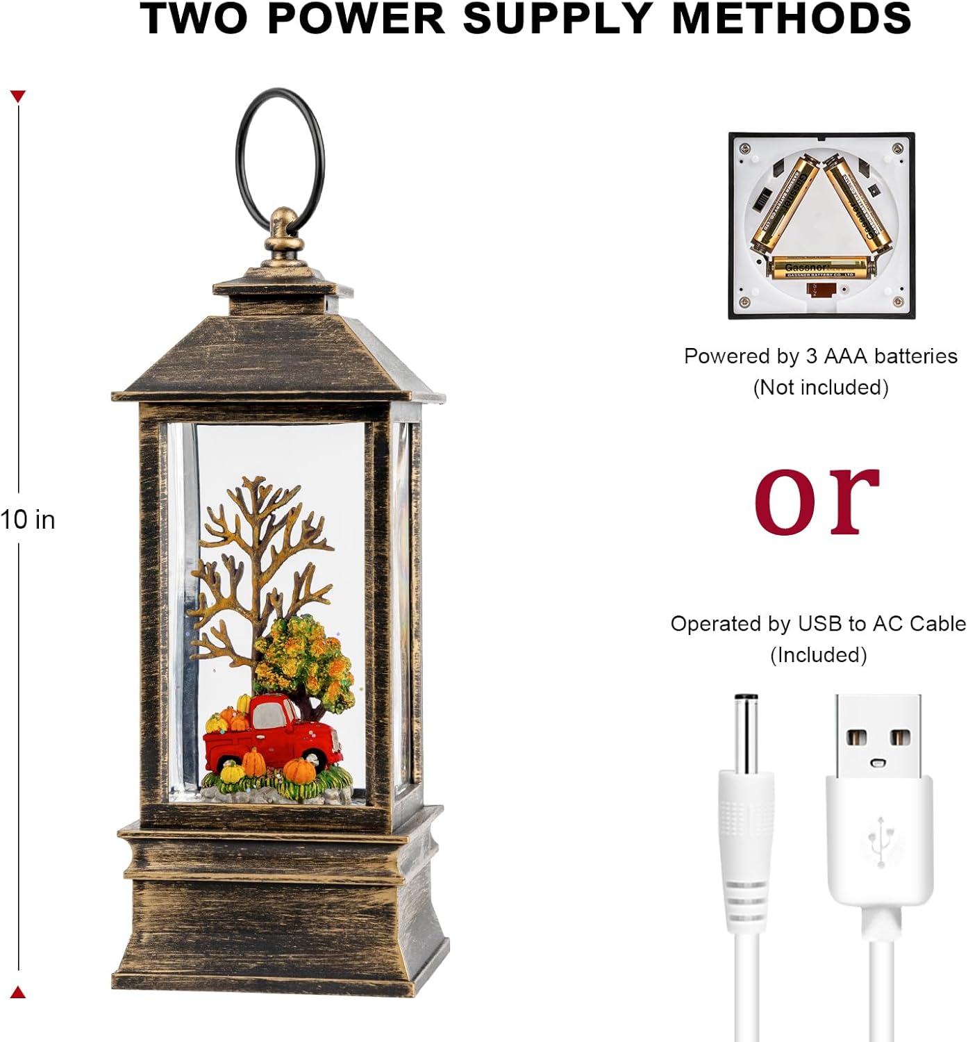 - 🍁【Celebrate Fall Harvest Day】Harvest scene with a red pickup truck hauling pumpkins lighted Water Lantern Snow globe for the harvest! The Swirling glittering flakes begin to fall from the tree trunk when switching on, impress your guests.