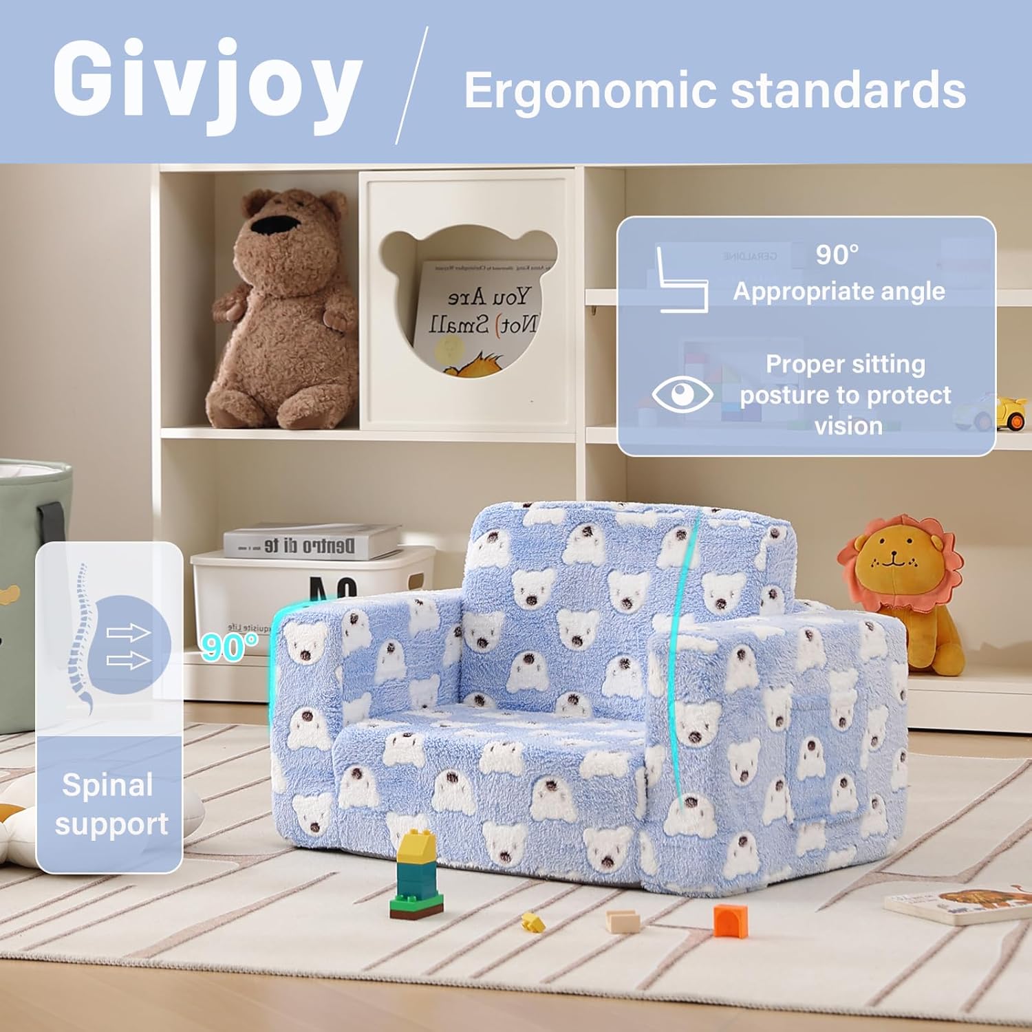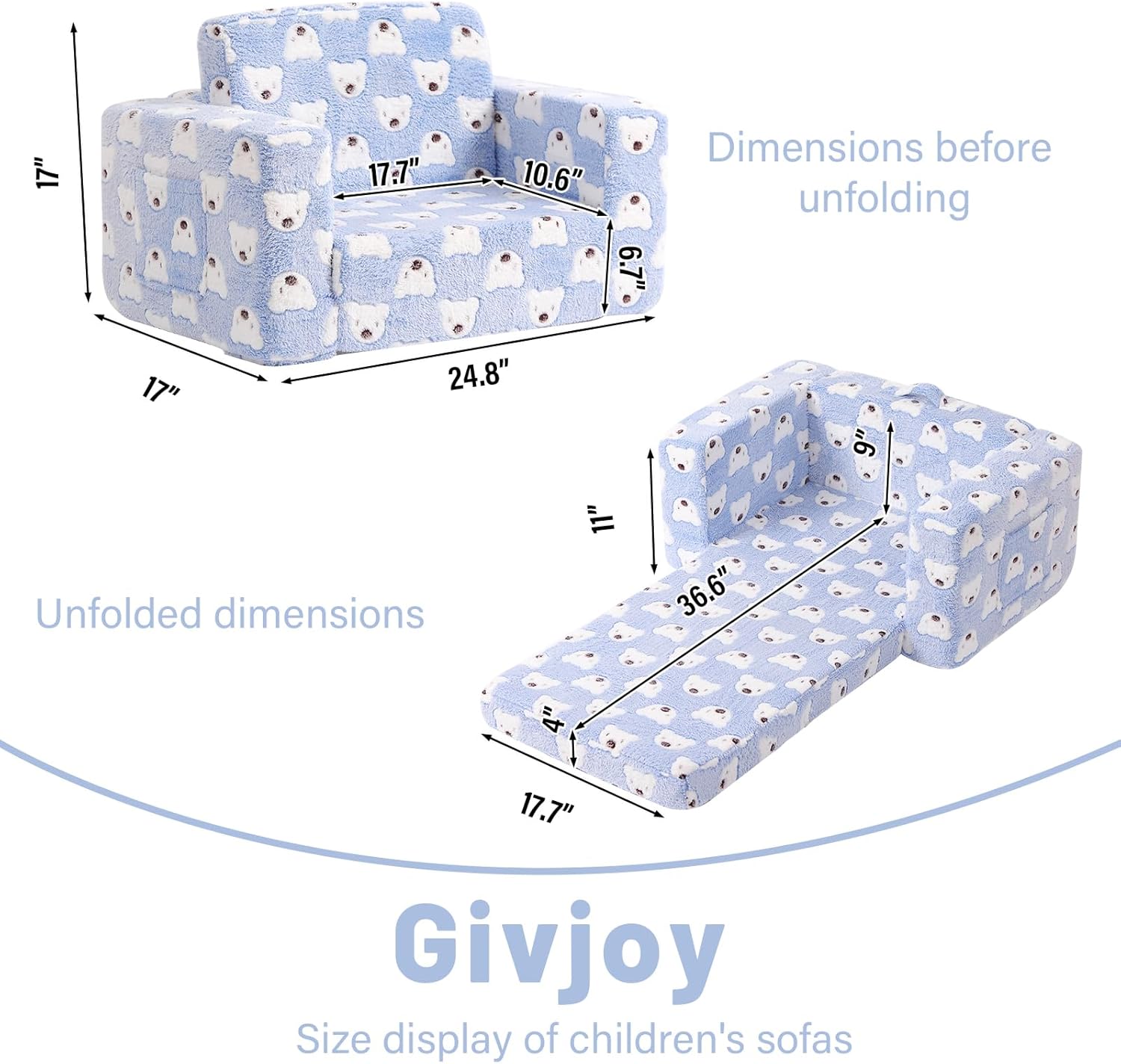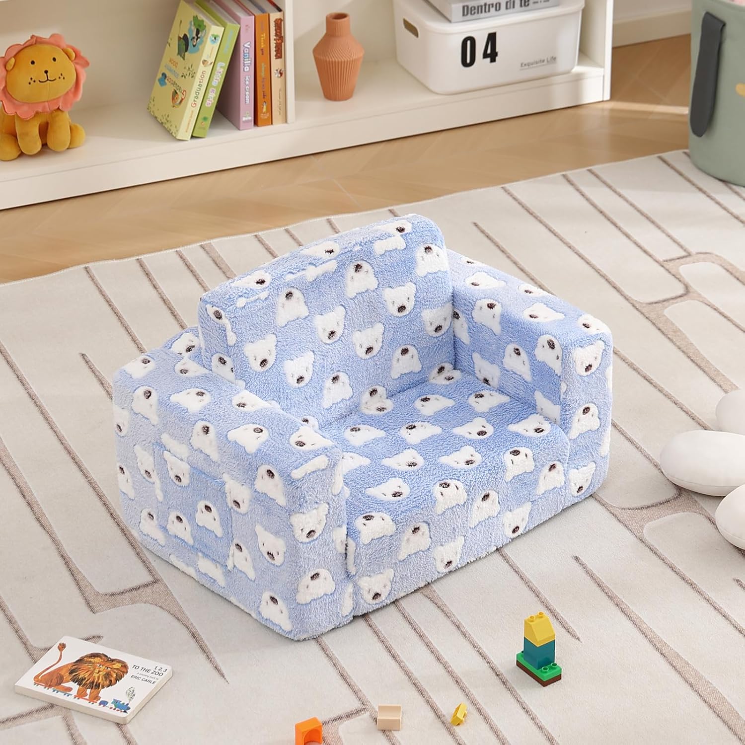 - 【Kids Sofa Requires No Assembly】The 2-in-1 toddler sofa couch is in vacuum packing. Open the Kids Couch packaging and you will get a soft plush Sofa for your kids. Please allow 4-5 days for the kids sofa couch to take on its original shape or use a clothing steamer to quickly restore its thickness and remove creases.