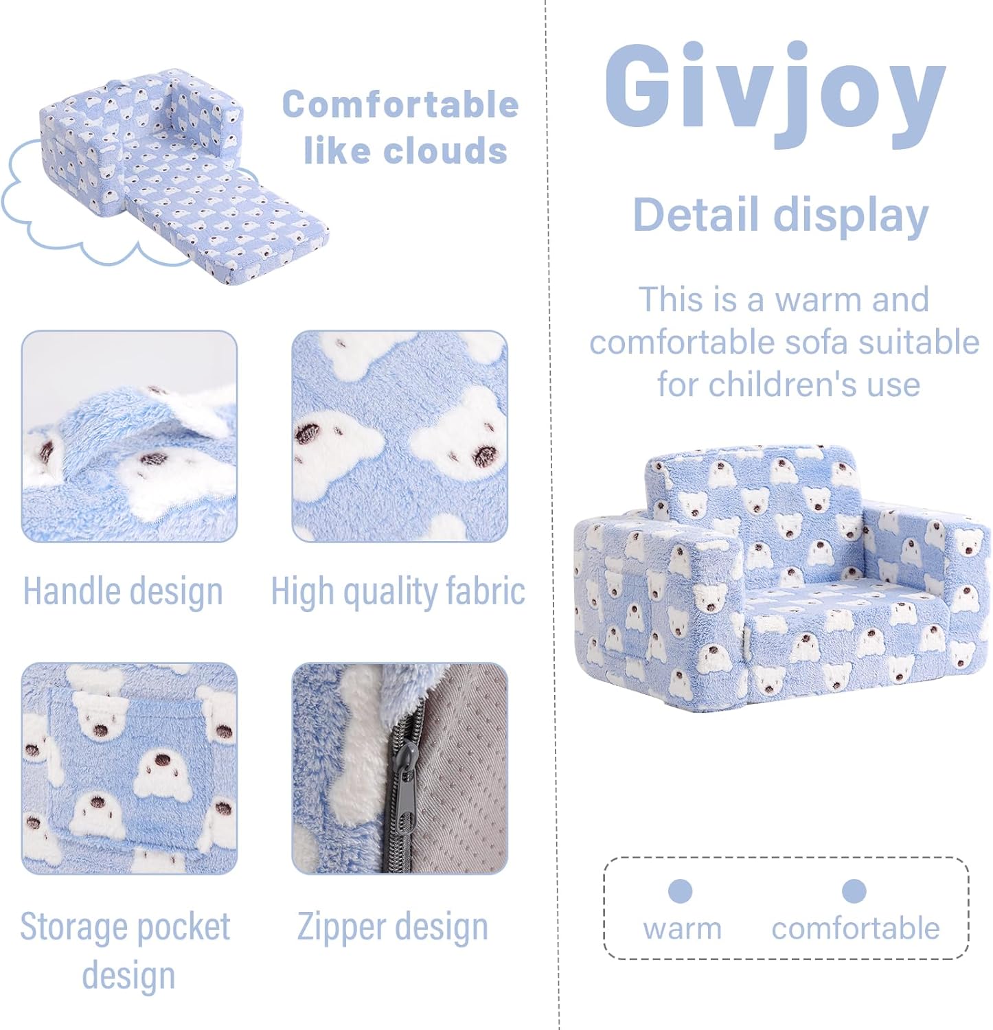 - 【Multifunctional 2-in-1 Design Unique Present for 18 months+ Boys and Girls】The 2-in-1 children's sofa couch is a wonderful present for all kids & toddlers on Birthdays, Christmas, or other occasions! Your child will find this small kids' couch a perfect spot for relaxing, reading, playing, or enjoying their favorite TV shows. Meanwhile, with both modern design and fashionable colors, this small couch can fit any room and add great vitality to your house.