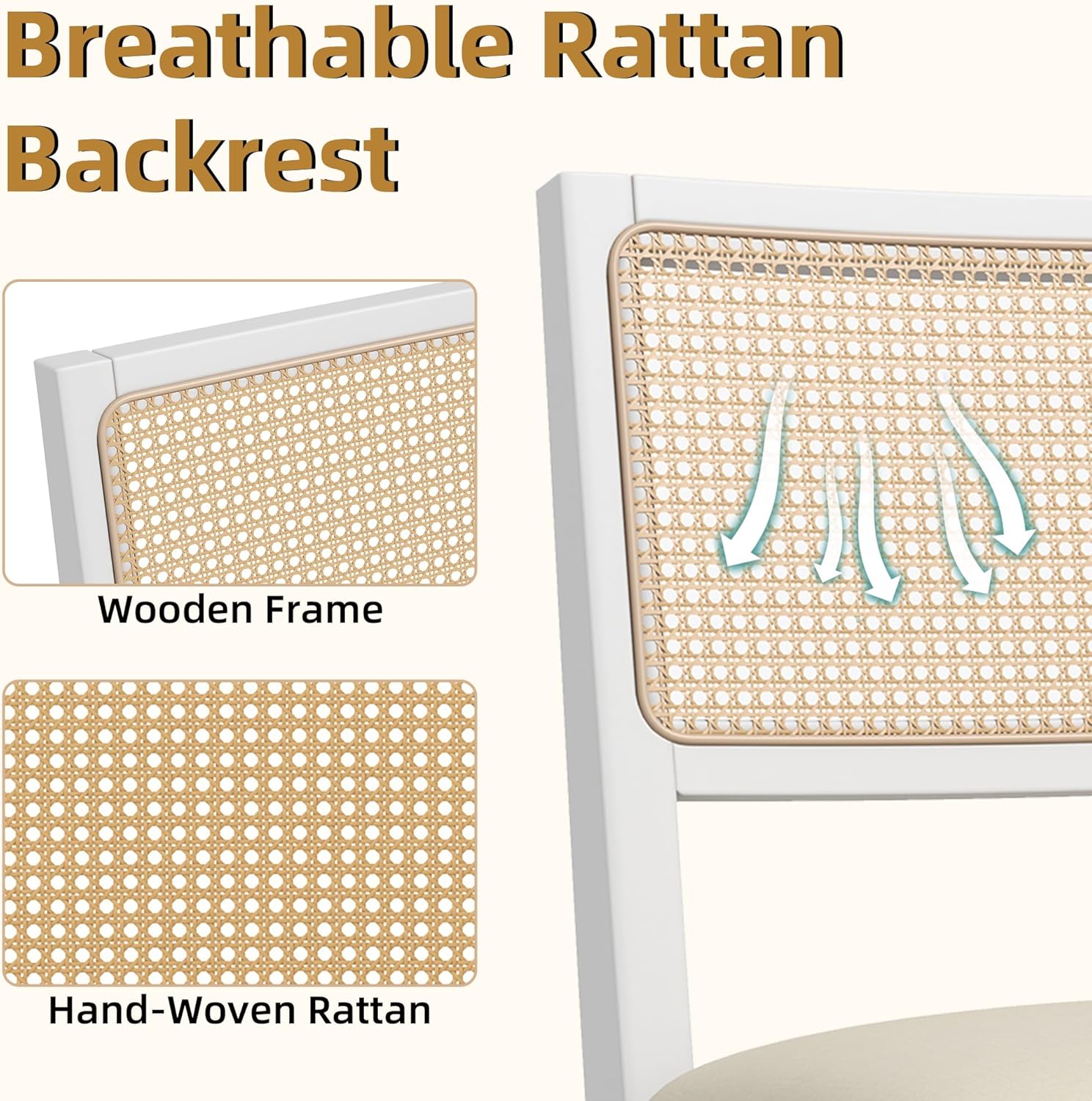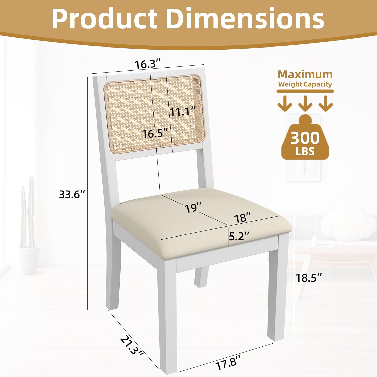 Westice Rattan Dining Chairs Set of 4, Farmhouse Natural Dining Room Chairs with Upholstered Cushion, Wood Armless Chairs for Kitchen/Restaurant, White