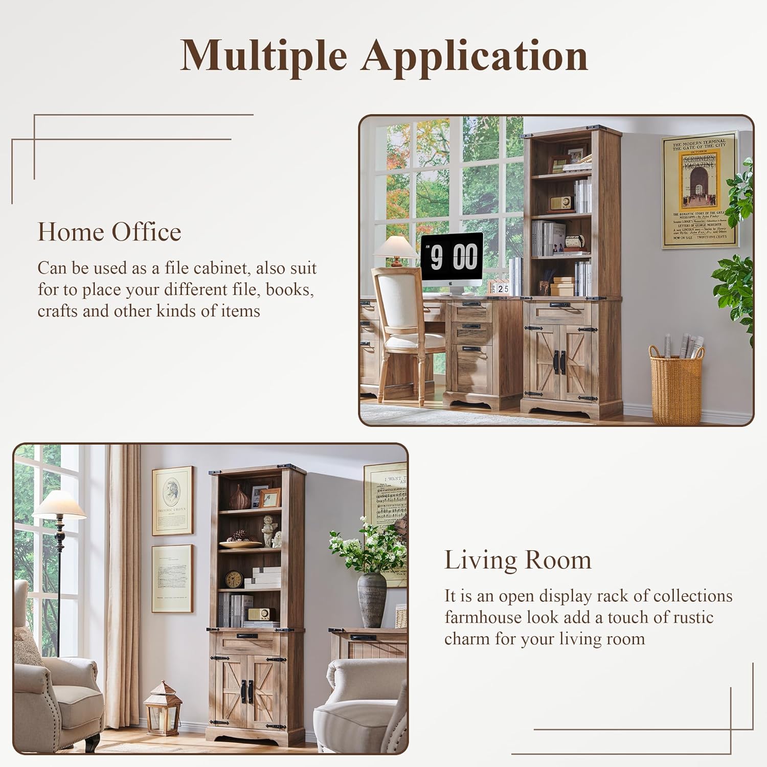 - Multi-Use: Office bookshelf designed like built-in cabinetry with handsome details that make it suitable for various room sizes. Together with functionality, it serves well as a bookshelf, pantry cabinet or display shelf in study room, kitchen and living room.