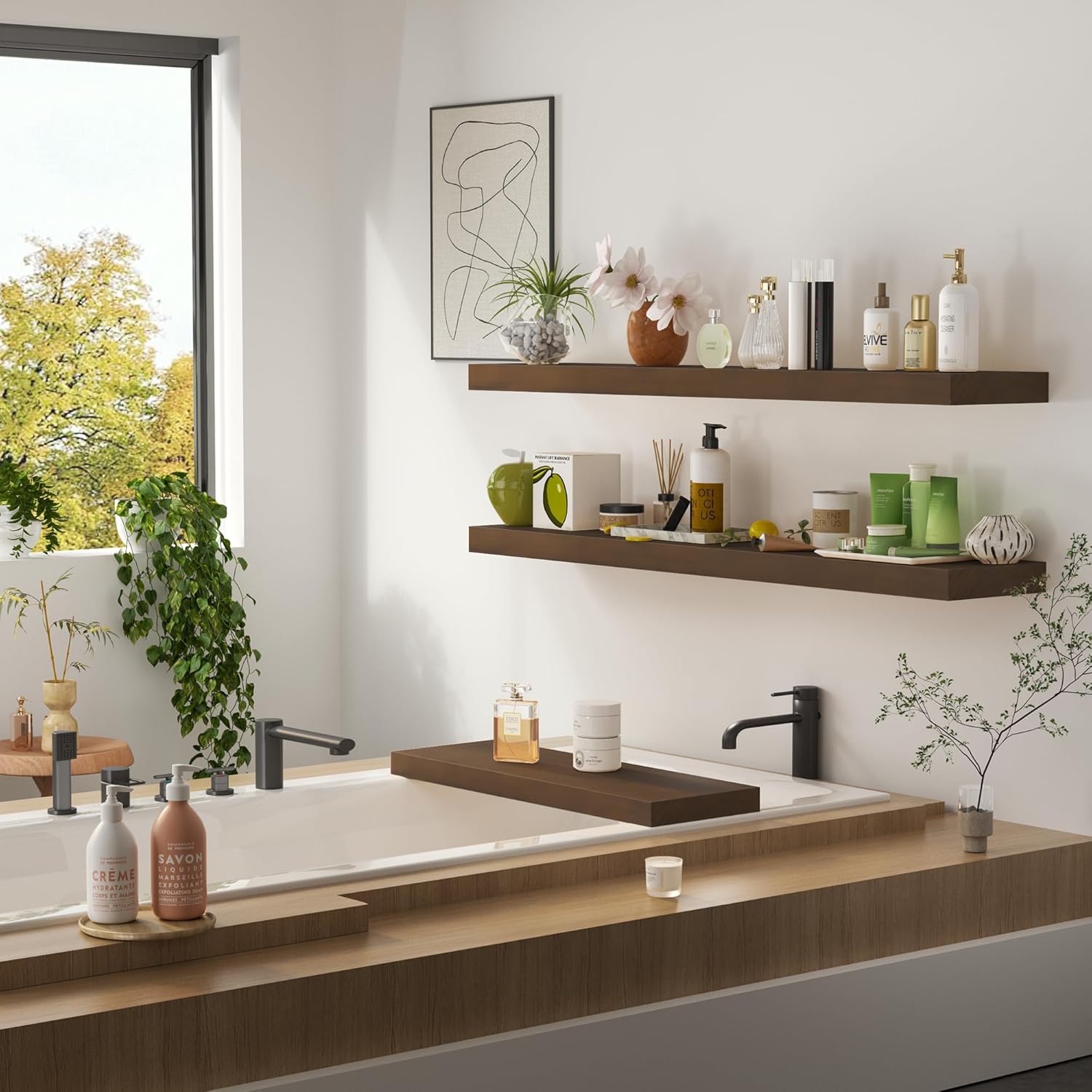 - Natural Wood & Wall Mounted Design - Slight color differences may occur due to lighting and screen settings.Our bathroom floating shelves for wall are made of wood which grows naturally, so each piece of the board has unique natural wood grain and color. Through the simplest charcoal roasting process, we restore the carbonized color and texture of the wood itself. It highly recommend them for anyone looking to add functional and stylish storage to their bathroom space.