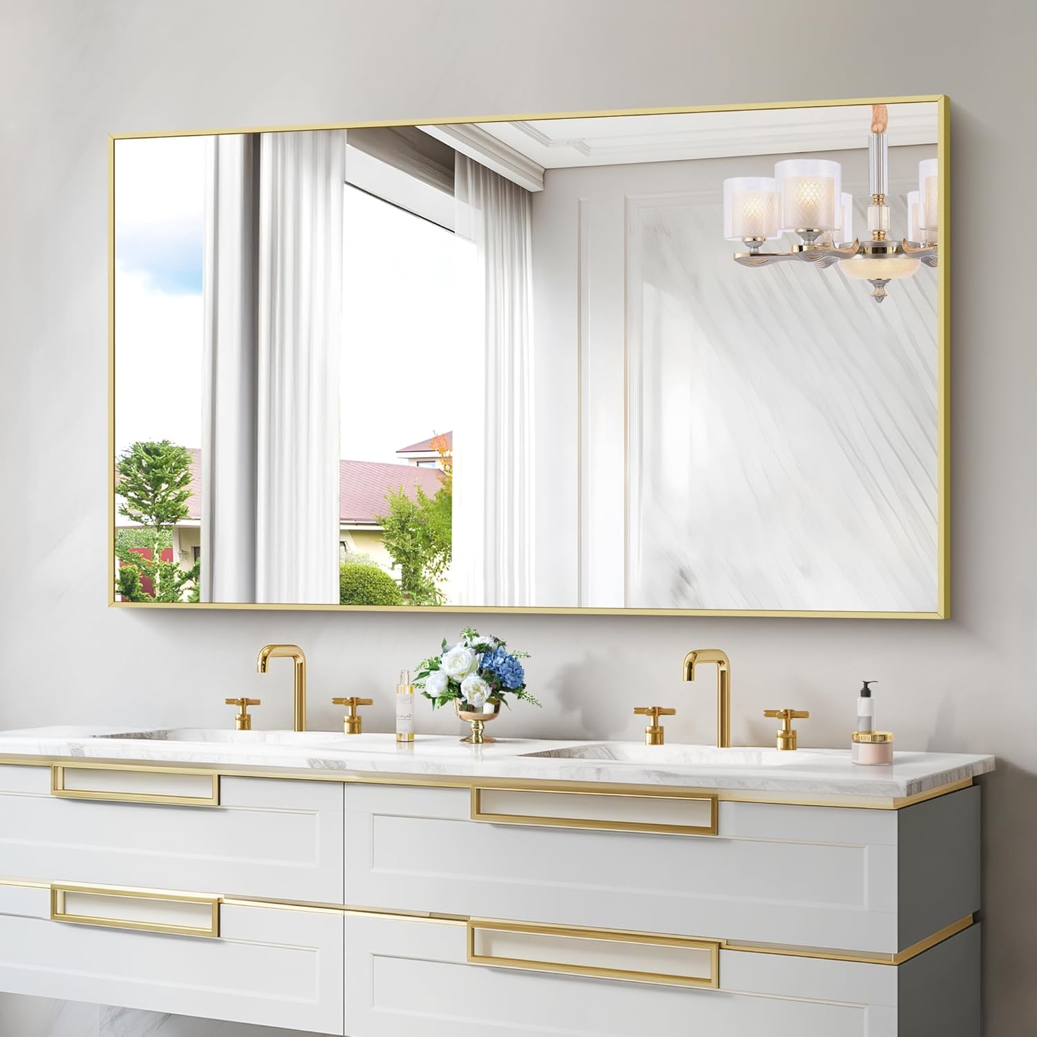 30x55In Gold Bathroom Mirror for Wall, Brushed Gold Rectangle Mirrors with Metal Frame, Bathroom Rectangular Mirror Modern Wall Mirror for Bedroom Living Room, Hangs Horizontal or Vertical