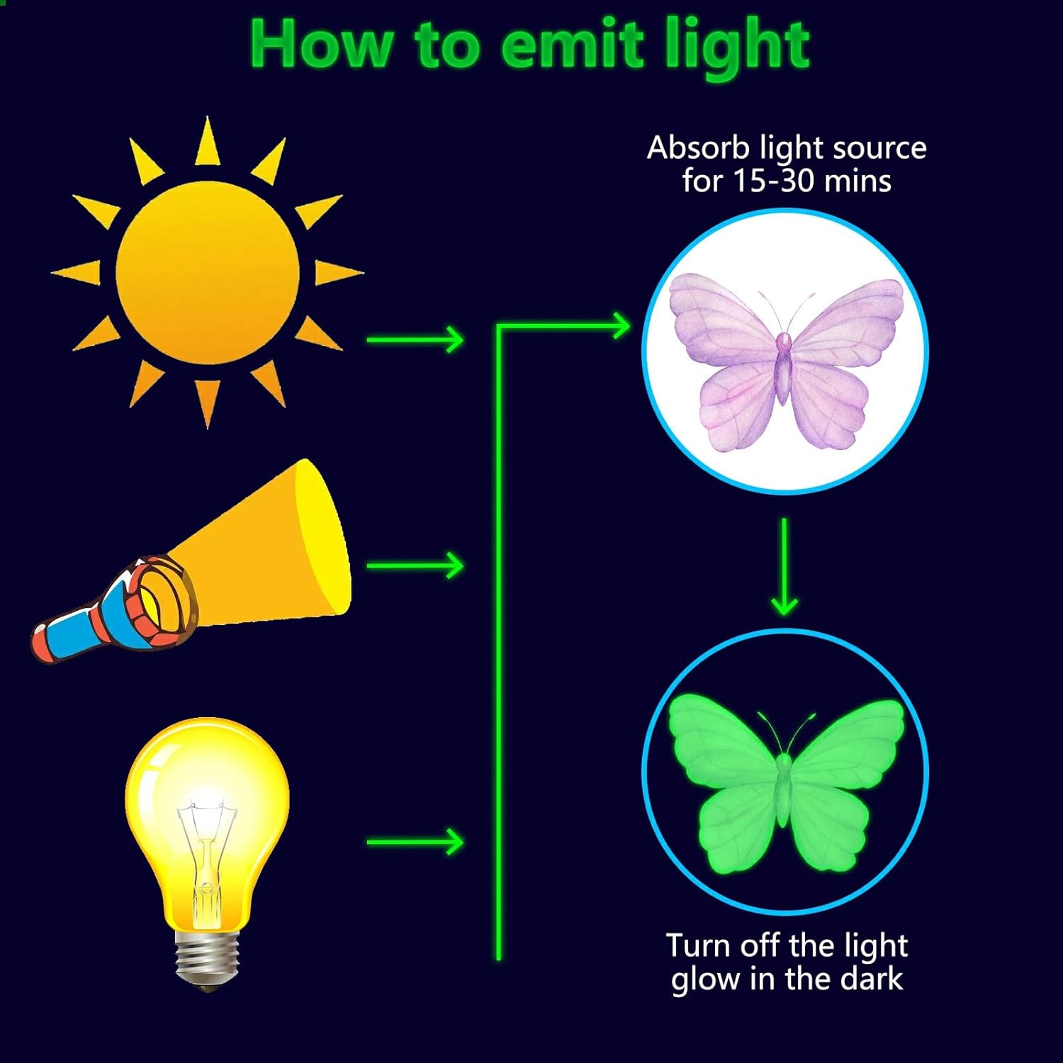 - ⦠Glow Butterfly Wall Decals: These glow wall decals for ceiling are made of quality luminous material,they will glow brightly when absorb enough light during the day. You just need to put it under lamplight flashlight ,room light or sunshine for 15 minutes, it will keep glowing for 8-10 hours with a gentle green fluorescent light. Please ensure the light shines on the decals without obstruction, the longer it takes to absorb light, then to light up for up to longer.