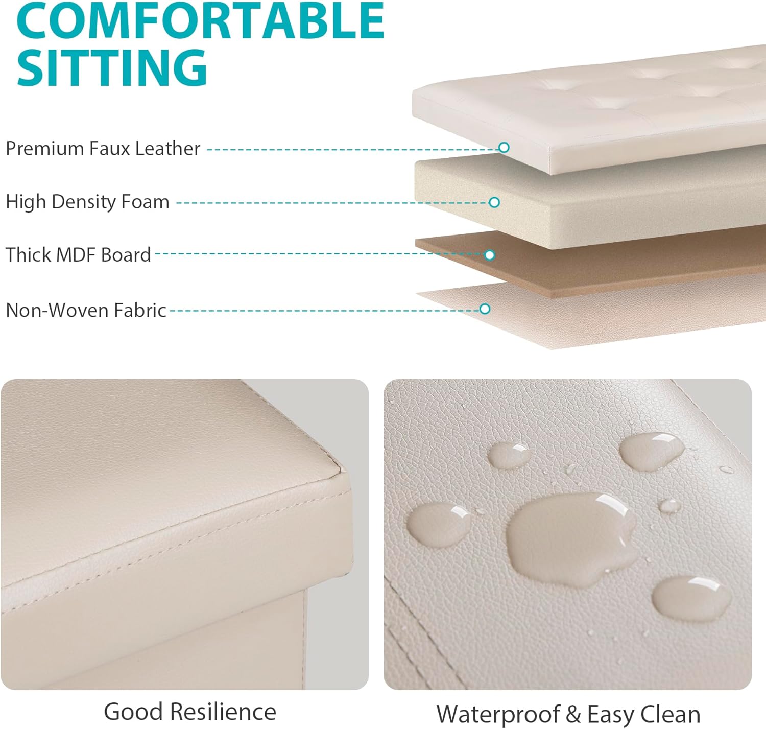 - Sturdy & Durable -- This comfortable long storage ottoman is made of quality thick cardboard, durable faux leather, has the load bearing capacity up to 350lbs. Waterproof linen fabric, built-in thickened sponge, make the cushion is soft and comfortable. The padded top is soft enough for sitting but firm enough to support you when folding laundry or having a quick seat.