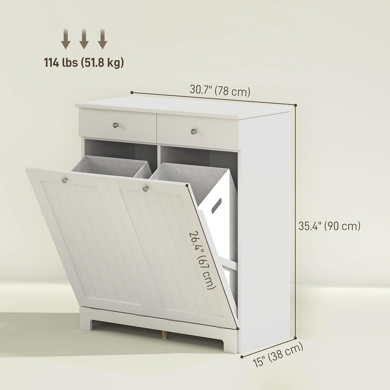 - Elegant Design: Equipped with two beadboard panel doors and round handles, tilt-out laundry hamper cabinet adds a modern touch to any room. The painted surface is easy to clean