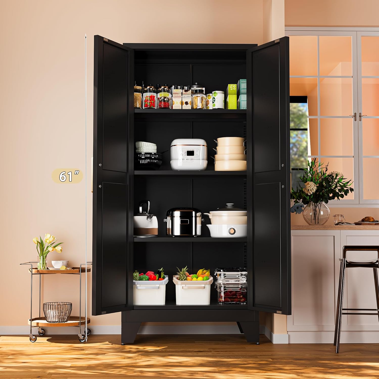 61" Tall Farmhouse Metal Pantry Cabinet, Kitchen Pantry Storage Cabinets with 2 Barn Door and Adjustable Shelves,Metal Pantry Storage Cabinet,for Kitchen,Laundry Room,Home Office,Kids Room (Black)