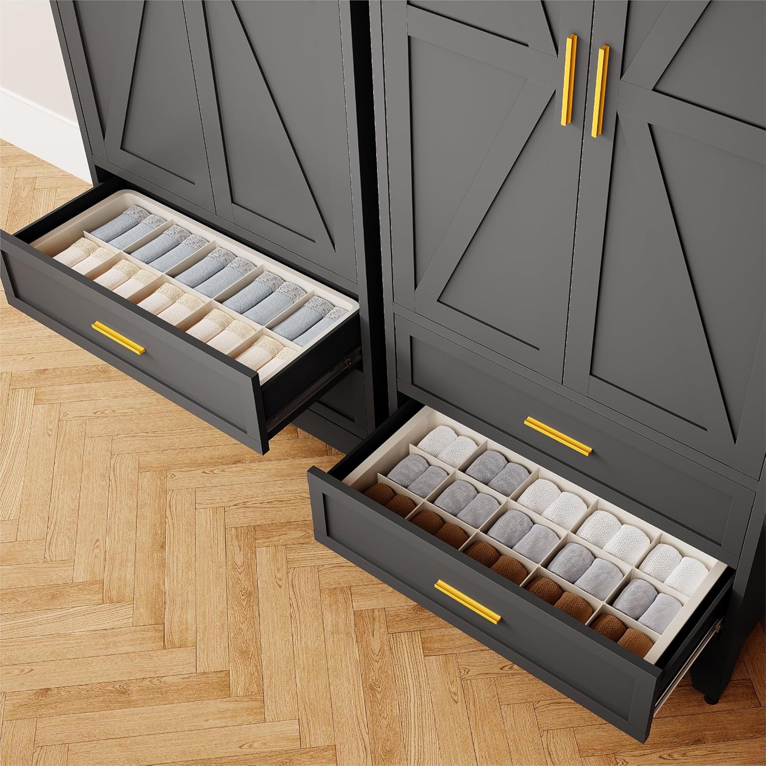 71'' Farmhouse Metal Wardrobe Cabinet with Hanging Rod, 2 Barn Door Wardrobe Closet with Adjustable Shelves,2 Drawer,for Dining Room,Bedroom,Living Room, Cloak Room,Office (Black)
