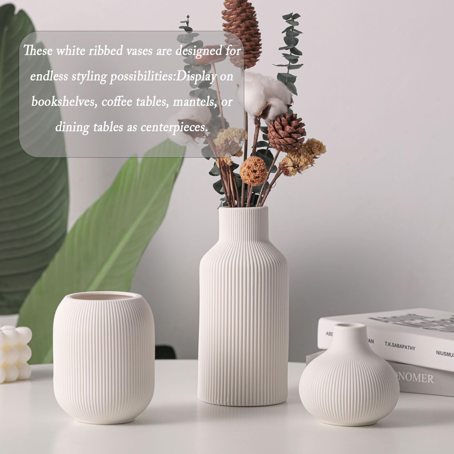 - Modern Ribbed Texture & Minimalist Design:Elevate your space with this set of 3 ceramic vases featuring ribbed texture and a sleek matte white finish. The modern minimalist design blends effortlessly with contemporary, farmhouse, or boho decor, adding subtle intrigue and sophisticated style to any room—no styling skills needed. Perfect as standalone accents or paired with faux/fresh flowers for a touch of elegance.