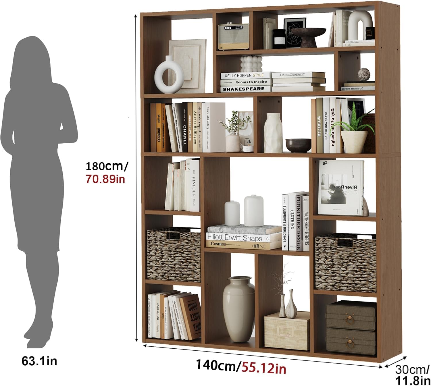 - Smart Storage Solution – The unique backless design with 16 irregularly arranged cubes (6 tiers total) offers versatile storage options, perfect for books, decor, and the included 2 premium foldable woven baskets that add both functionality and style.