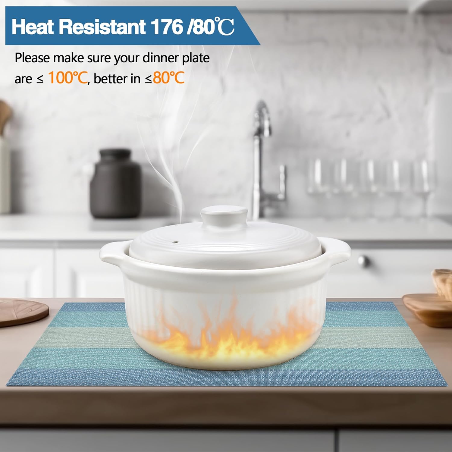 - Heat Resistant: Please make sure your dinner plate are ≤ 100℃, better in ≤80℃. It can prevent the table from slipping and scalding the countertop. These beautiful stylish vinyl place mats to add more fun to your dining table