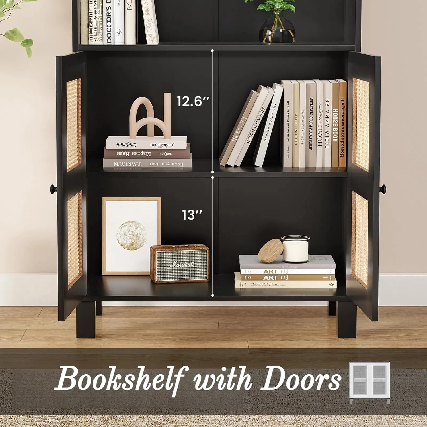 Tall Bookshelf, 5-Tier Book Shelf with 2 Rattan Doors, Freestanding Bookcase Display Shelves with Large Storage, Book Case for Living Room, Office, Study, Bedroom, 70.9 Inch