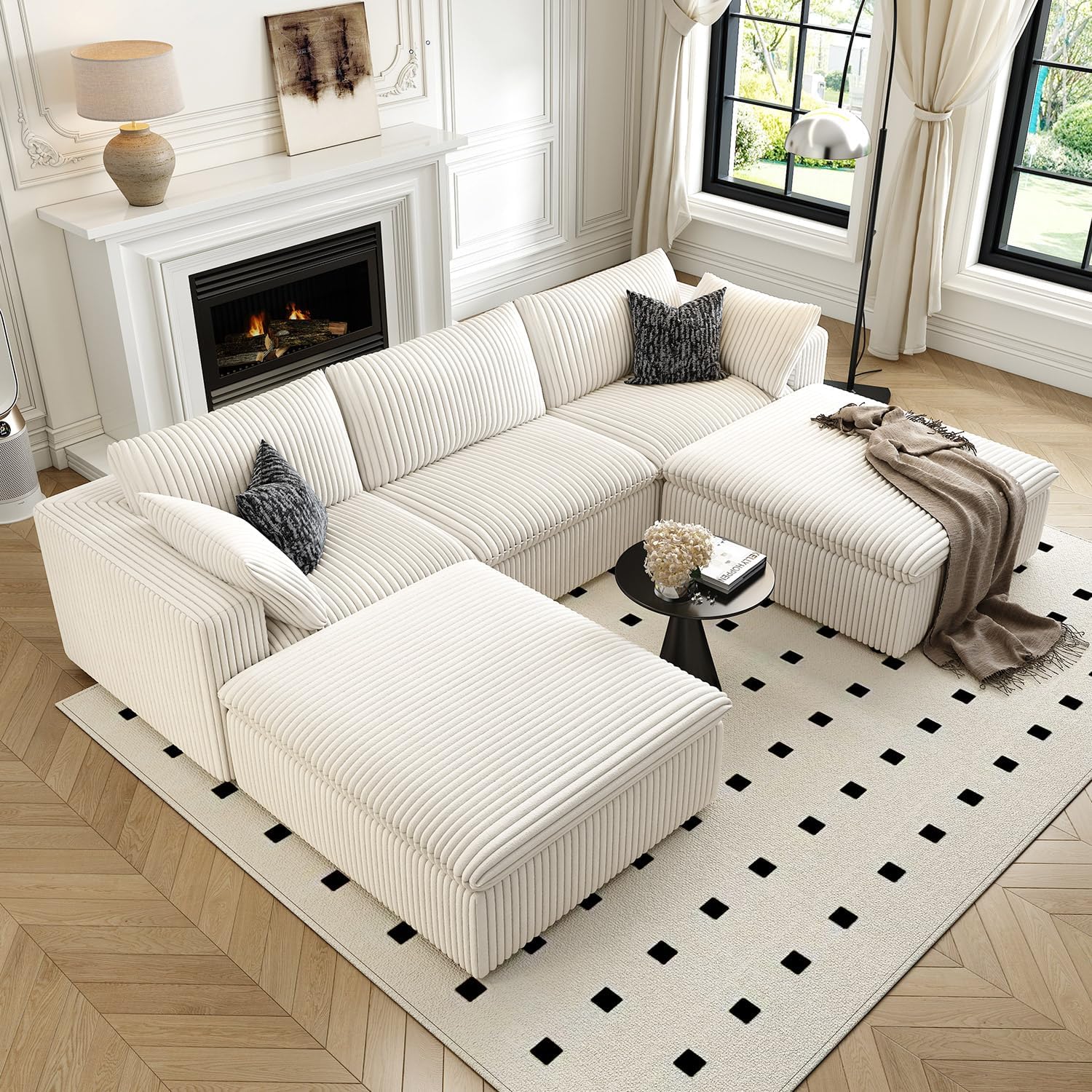 118" Cloud Couch Modular Sectional Sofa for Living Room,Modern Sofa with Deep Seat,U-Shape Boneless Couch with 2 Ottoman,Comfy Upholstered Corduroy Couches for Apartment, Studio, Office,Bedroom,White