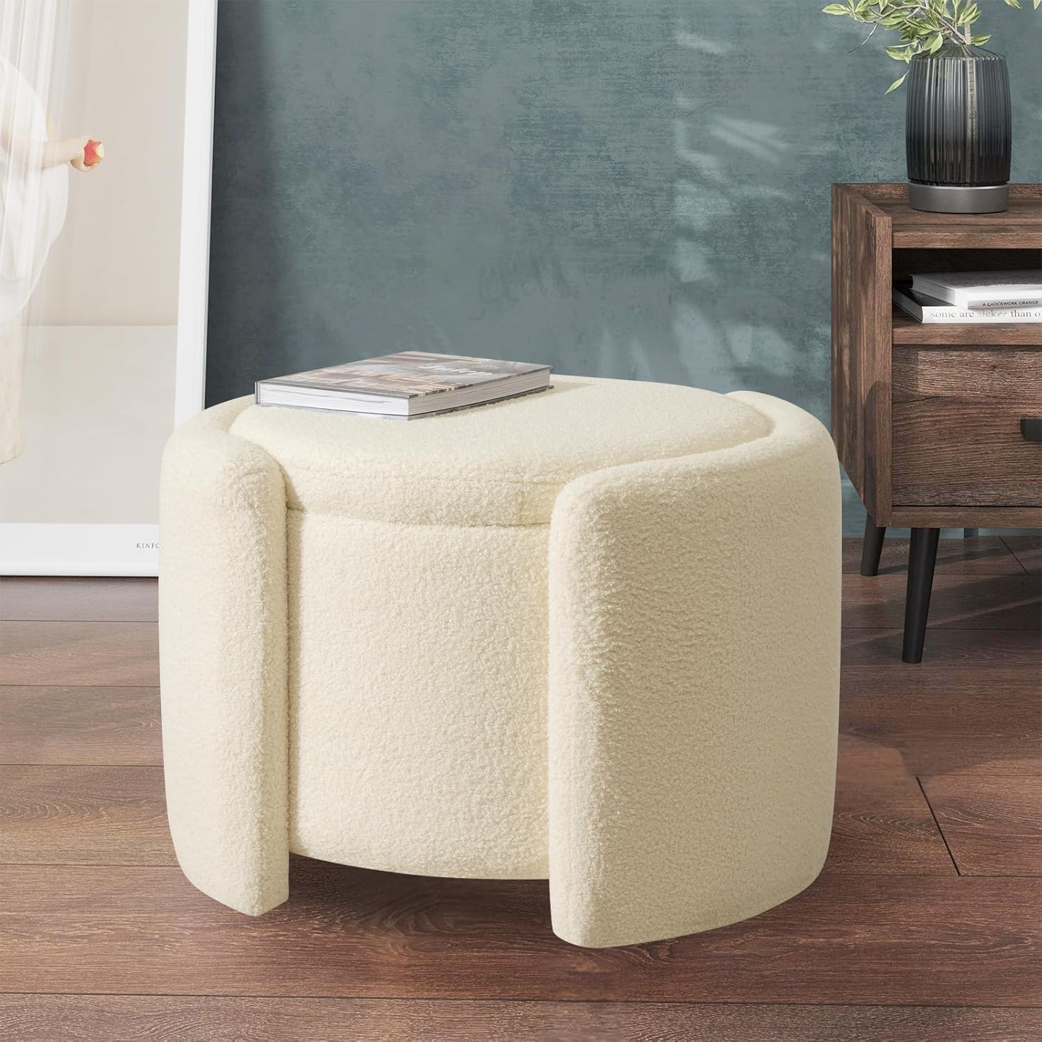 Furniliving Upholstered Button Tufted Round Ottoman, Ottoman with Storage, Teddy Footrest Stool, Removable Lid Convenient Footstools, Bedroom Ottomans with Storage for Vanity, Living Room, Beige