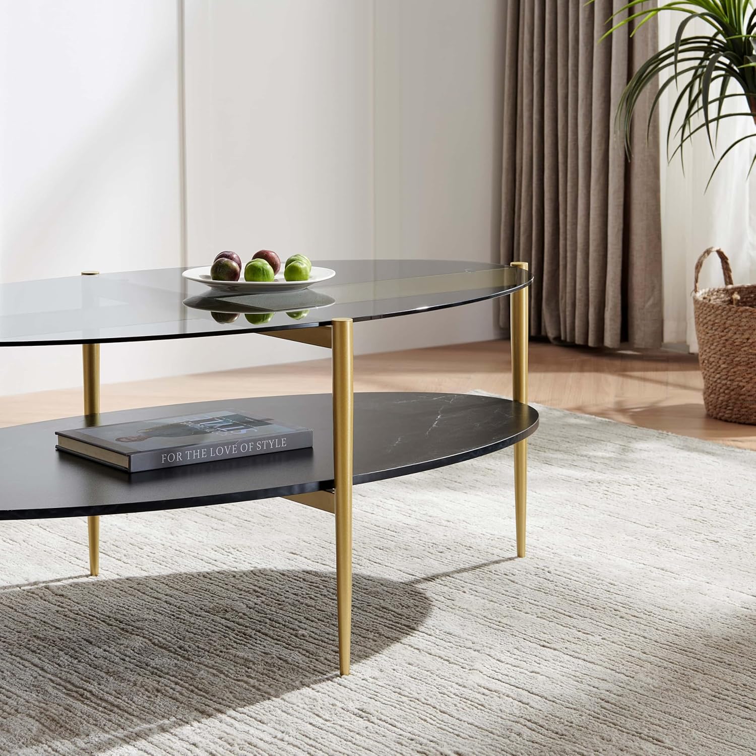 Oval Glass Coffee Table, Mid-Century Modern Design, L43 x W22 x H17 inch, Surfboard Shaped Grey Glass Top and Black Marble Finish Wood Shelf, Tapered Legs with Gold Finish Frame